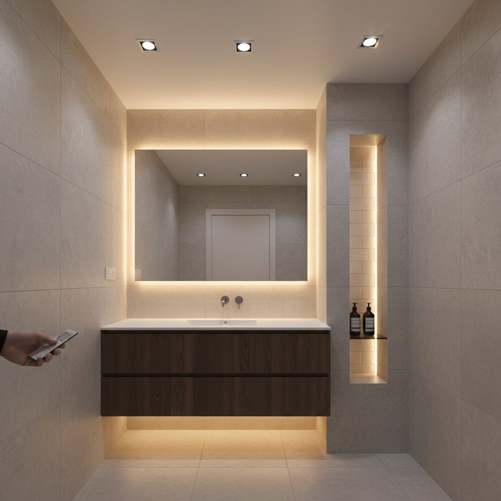 A modern bathroom with a person’s hand holding a remote control, adjusting the warm, indirect LED lighting around a large mirror. | Generated by Google Gemini